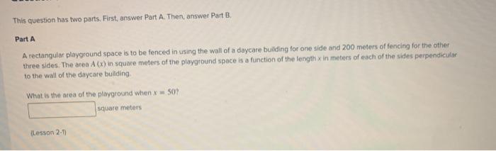 Then answer Part B. The area in square meters of the playground space is a function of the length in meters of each of the sides perpendicular to the wall of the daycare building. The smaller dimension is - x.